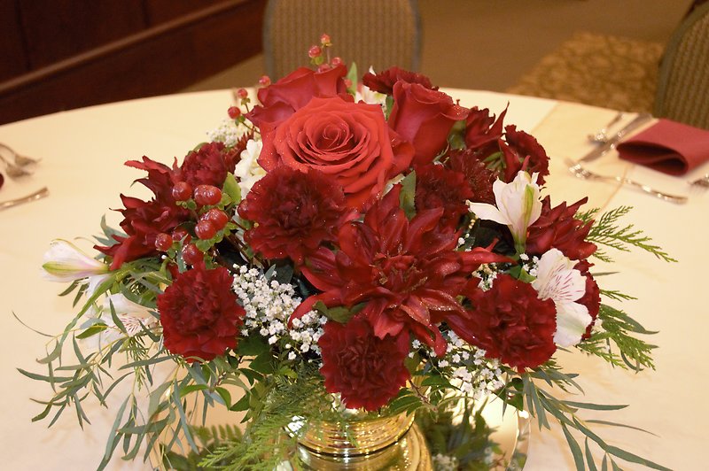 Red Roses and Carnations with Berries and Red Pomps Centerpiece