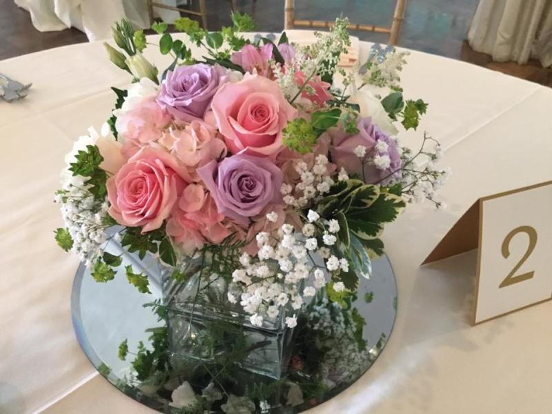 Purple and Pink Roses with Pink Hydrangea and Babies Breath in Clear Cubes on Mirrors Wedding Centerpiece