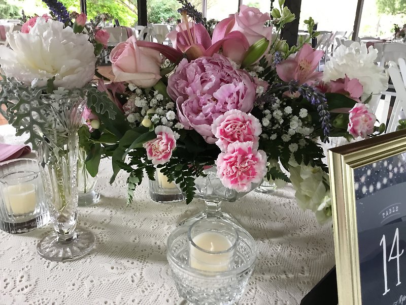 Pink Roses in Pink Containers with White in Smaller Bud Vases Surrounding Hurricane Candle Centerpiece