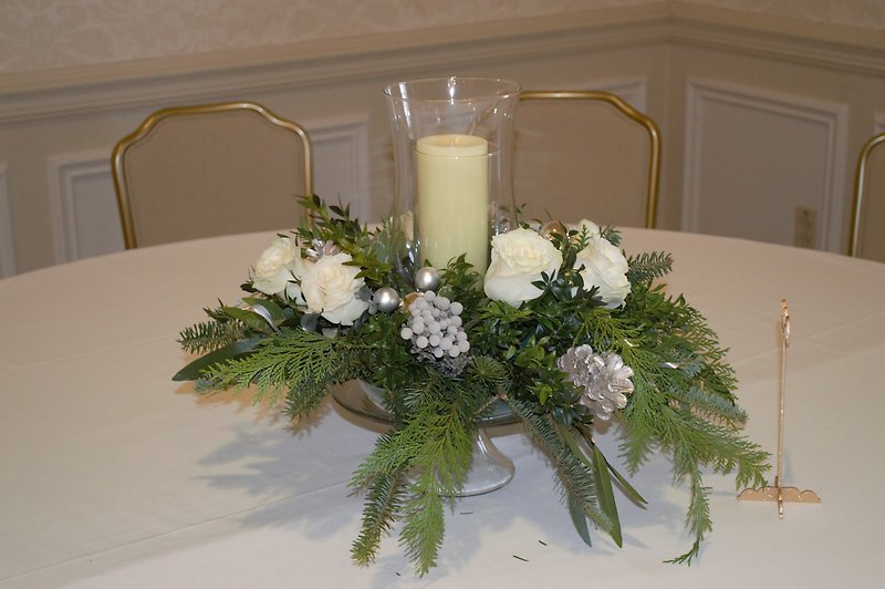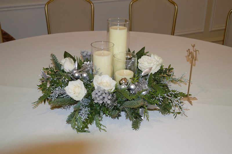 Three Candle with White Roses Winter Centerpiece with Silver Winter Berries and Silver Highlights