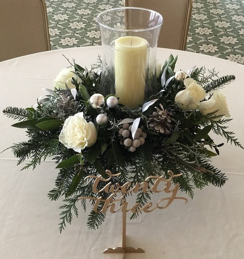 Winter Rose Hurricane Candle Winter Centerpiece with Silver Winter Berries and Silver highlights