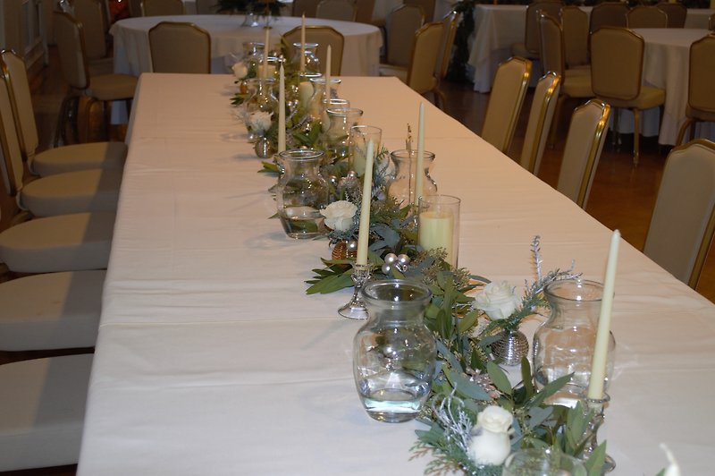 Bridal Table White Roses Winter Table Runner with Candles, Berries and Pinecones and Glass Vases for Bridal Party Bouquets