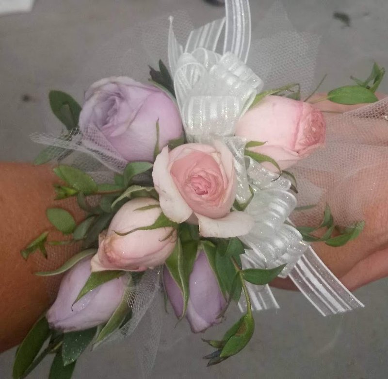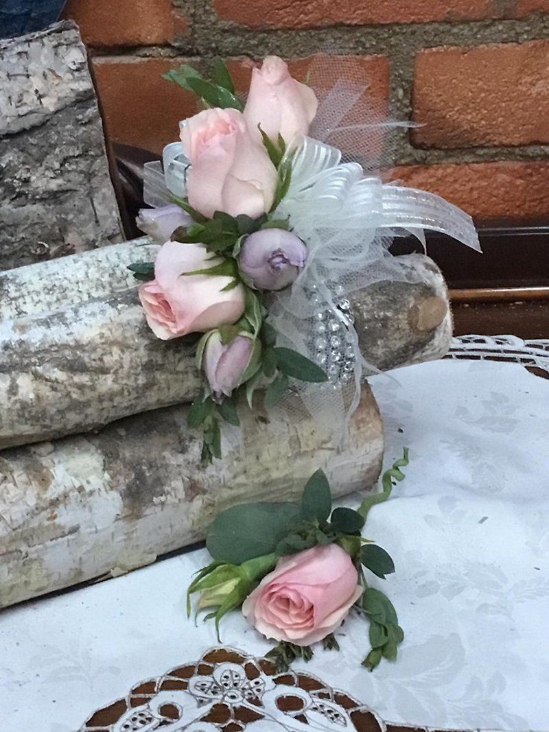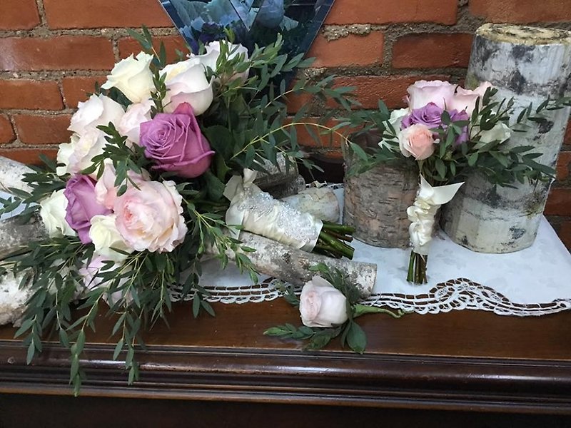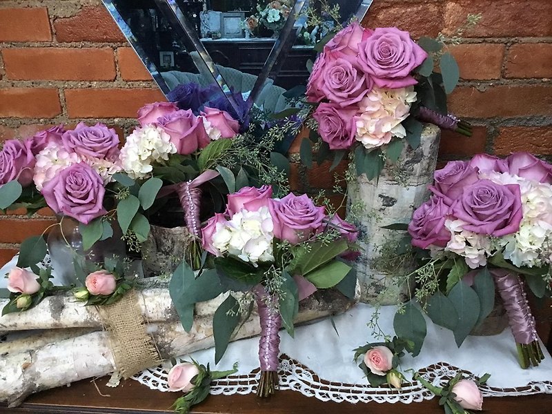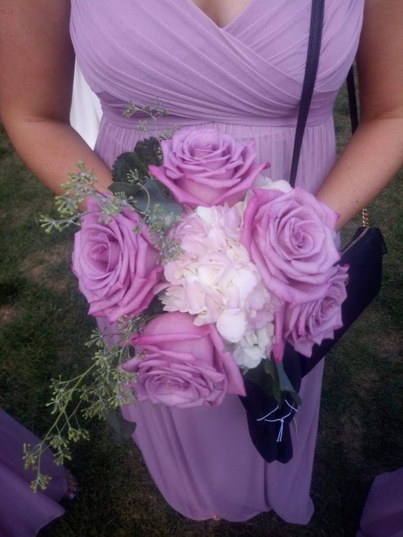 Bridesmaid bouquets, what a match to the dress! Purple Roses, with white roses