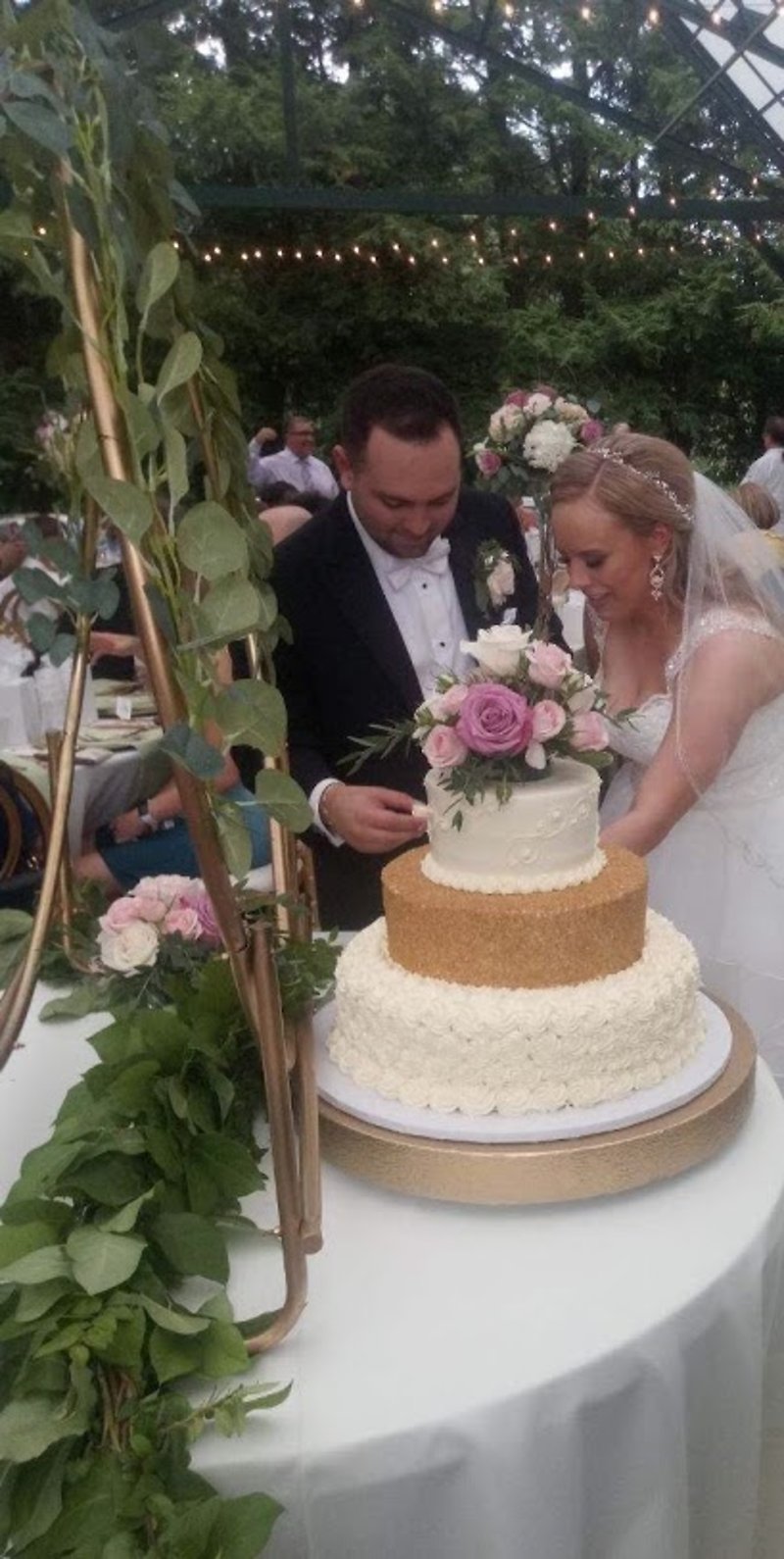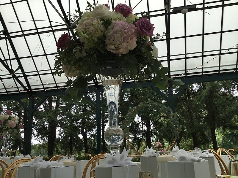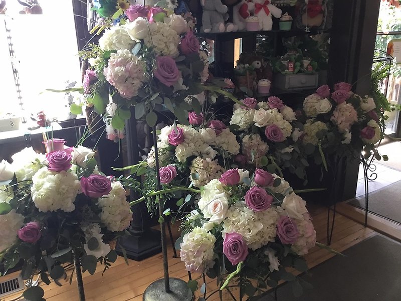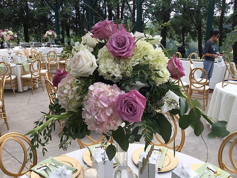 Close up of Centerpieces of Pink and White Hydrangeas and Purple Roses